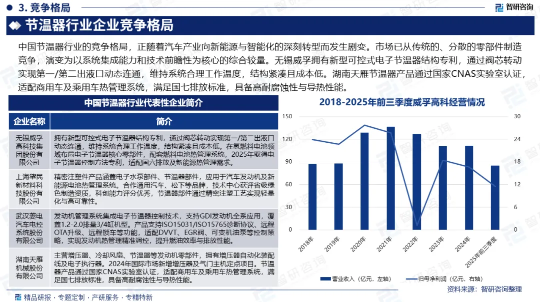 竞争情况:中国节温器行业的竞争格局,正随着汽车产业向新能源与智能化的深刻转型而发生剧变。市场已从传统的、分散的零部件制造竞争,演变为以系统集成能力和技术前瞻性为核心的综合较量。无锡威孚拥有新型可控式电子节温器结构专利,通过阀芯转动实现第一/第二出液口动态连通,维持系统合理工作温度,结构紧凑且成本低。湖南天雁节温器产品通过国家CNAS实验室认证,适配商用车及乘用车热管理系统,满足国七排放标准,具备高耐腐蚀性与导热性能。