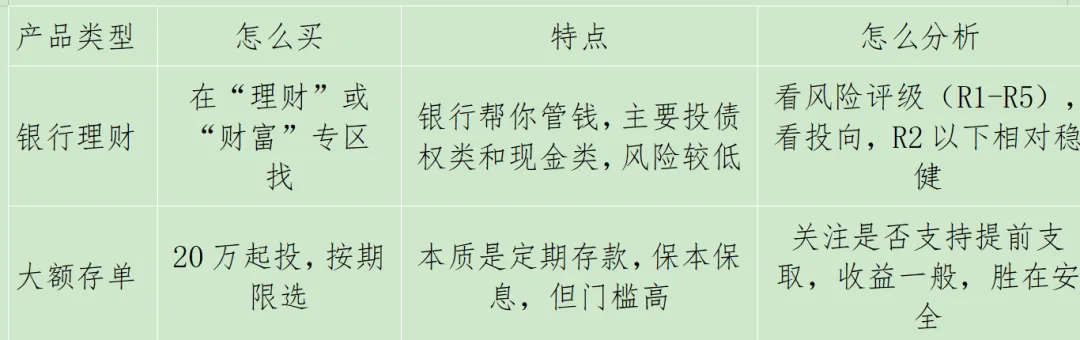 银行App里,有两种东西:一种是银行自己发的银行理财,一种是代销的保险、基金、黄金等。适合我们普通人的,是银行自己的理财和大额存单。