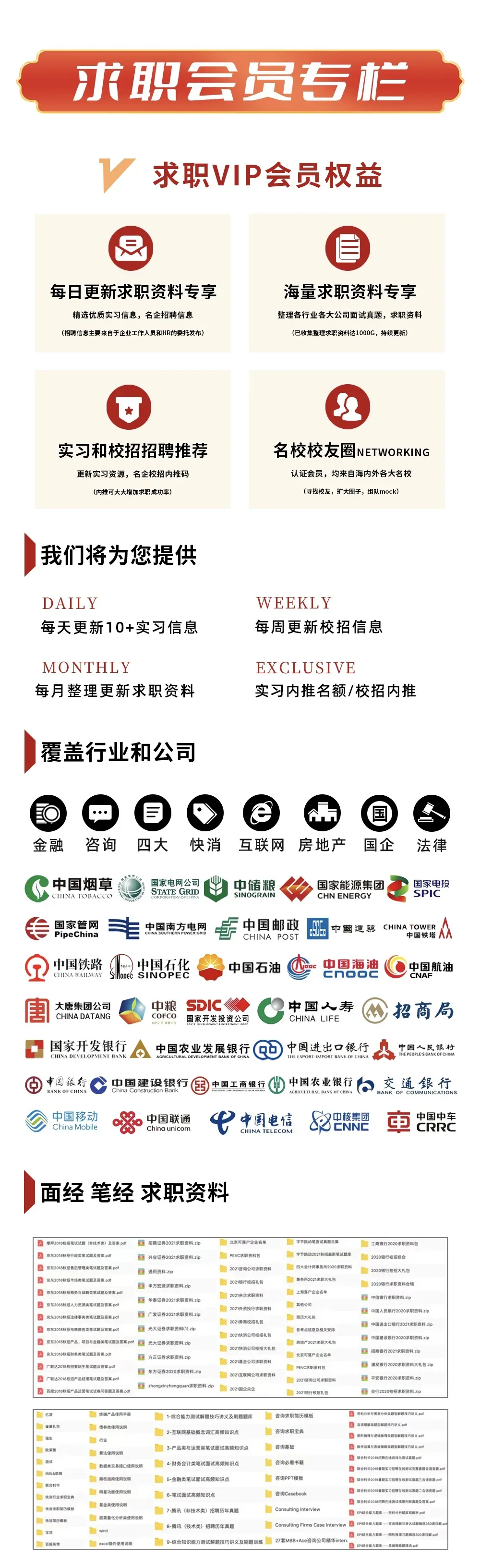 .................... 其他岗位汇总 2025-2026年度会员将获得25个+招聘汇总表权益,每个表格将持续更新到周期结束 3:整理求职资料,包括简历模板,行业知识、笔试真题、模拟题、面试资料、求职指南、技能自学攻略等等,都会第一时间分享给VIP会员。部分展示如下👇