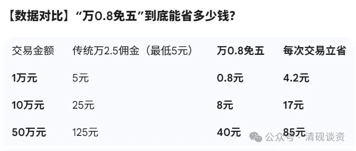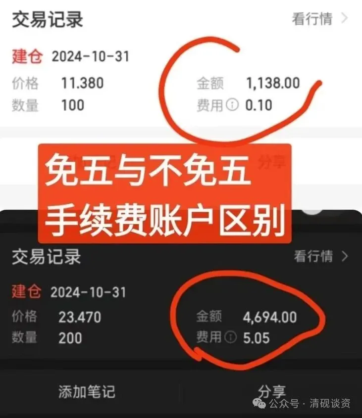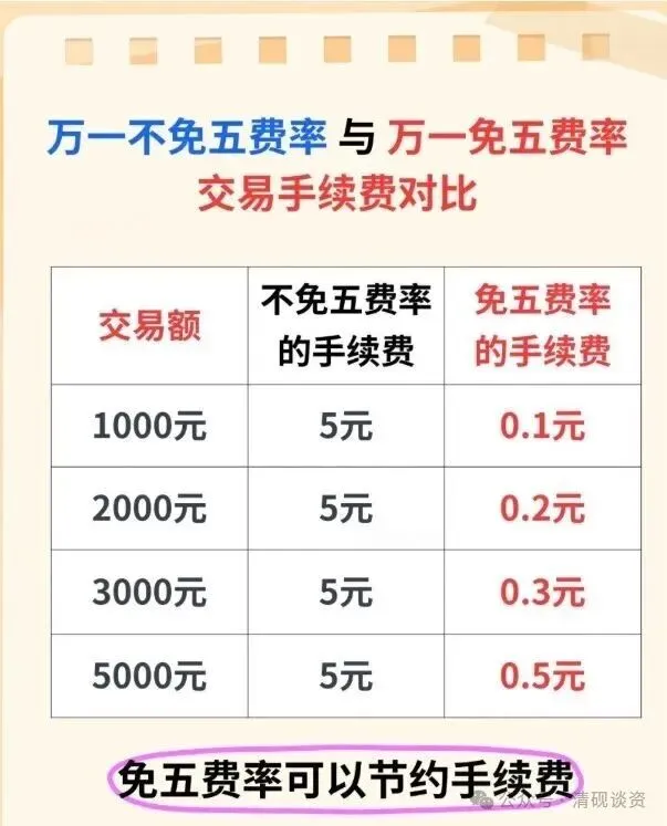 这才是精髓!“免五”就是取消“单笔交易佣金最低5元”的霸王条款,按实际成交金额计算。对于单笔交易金额常低于6万元的朋友,“免五”的重要性甚至超过了佣金率本身!
