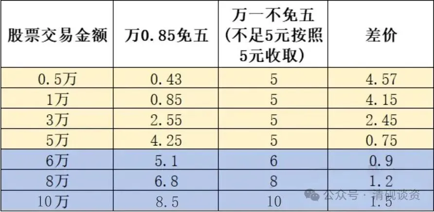 别人的“万0.85免五”账户:佣金就是10000 × 0.0085% = 0.85元。