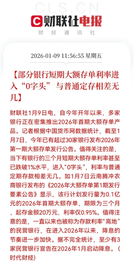 与此同时,银行存款正悄然“缩水”。2026年初,多家银行陆续发行新一期大额存单,但部分利率甚至降至“0字头”,与普通定期存款相差无几。“存款搬家”也因此成为当前最受关注的财经话题。