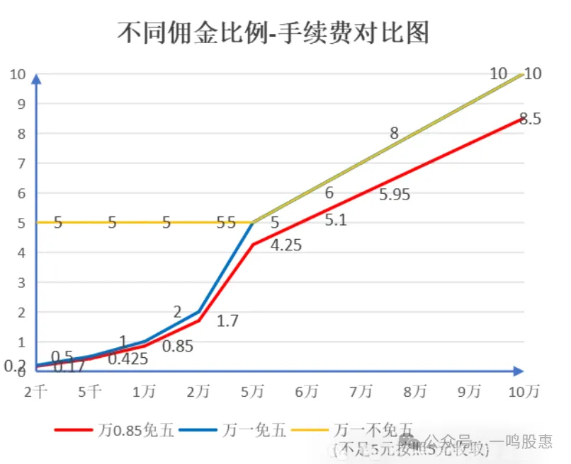 简单来说,“万一”指佣金费率为万分之一;“免五”指取消每笔交易最低5元的收费门槛。我们来算一笔账: