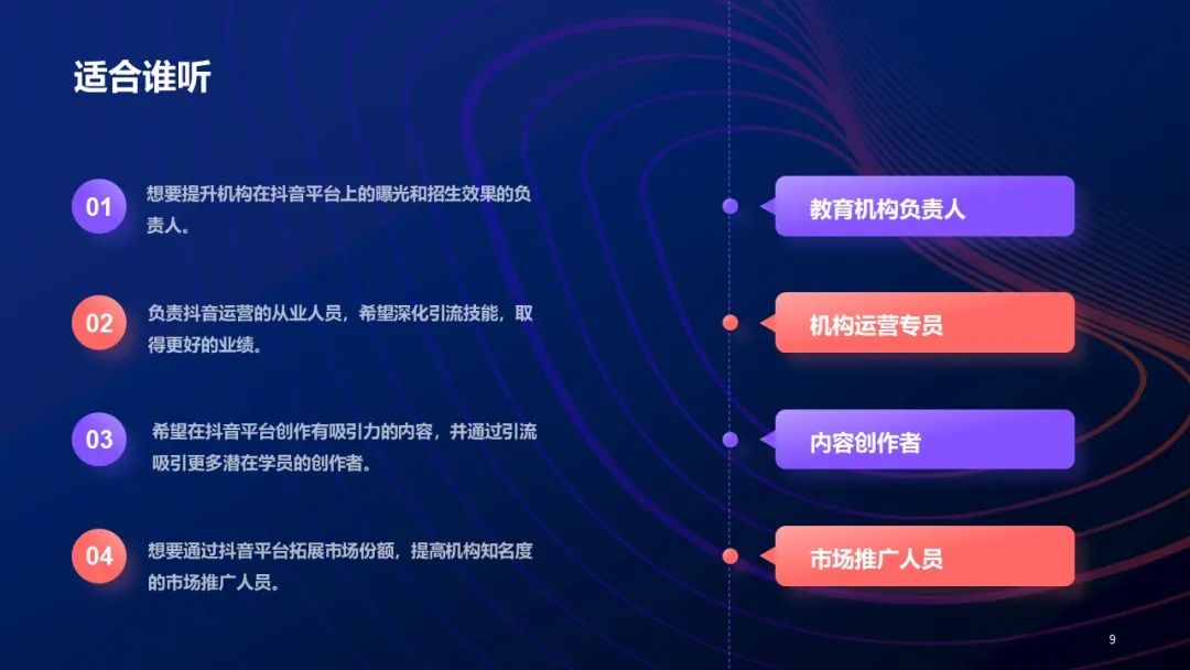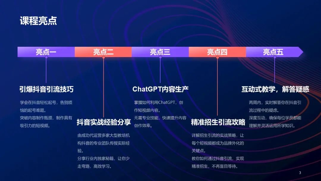 然后关于课程亮点啊这些的,就不吹了,大家看看就好了,我觉得最大的亮点是实战经验分享,避免大家继续做无用功踩坑,或者又花大价钱去搞外包,没效果还破费。这个训练营保底能让你了解教培机构的抖音该怎么去做,内容该怎么写,数据该怎么查,至少不会被外包给忽悠。