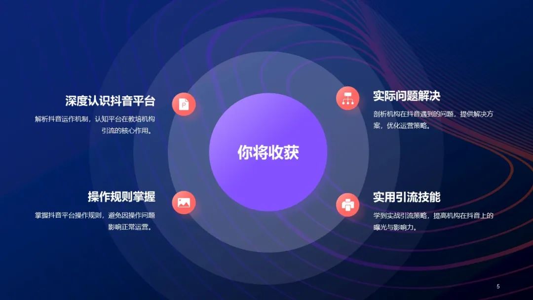 第一天的课程主要是由浅入深教,从现在大多数教培机构的抖音进行账号分析,为大家指出问题所在,然后告诉大家正确的打开方式。还有抖音的规则,如何起号、账号的关键要素、矩阵号要创建哪些等等。