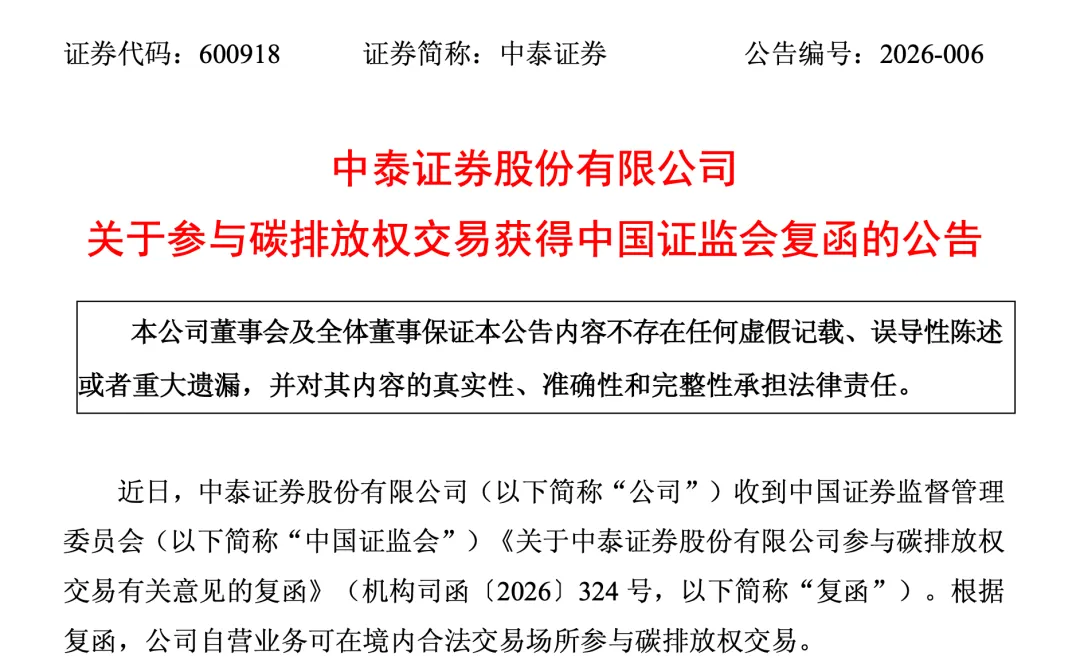 中泰证券在其公告中表示,收到的中国证监会《关于中泰证券股份有限公司参与碳排放权交易有关意见的复函》(机构司函〔2026〕324号)明确,公司自营业务具备在境内合法交易场所参与碳排放权交易的资格。这对于中泰证券而言,无疑是拓展业务版图的一个新契机。碳排放权交易市场近年来发展迅速,随着全球对气候变化问题的日益重视以及我国“双碳”目标的推进,该市场蕴含着巨大的潜力。中泰证券参与其中,有望在这一新兴领域探索新的盈利增长点,同时也能更好地服务客户在绿色金融方面的需求。