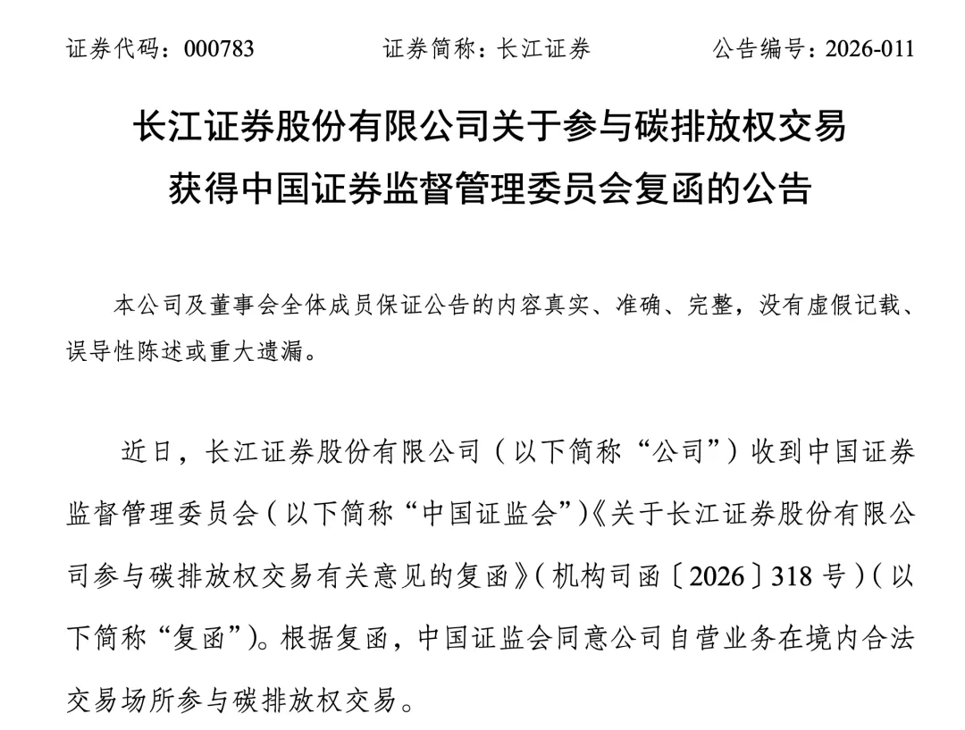 长江证券同样收到了中国证监会的复函(机构司函〔2026〕318号),中国证监会同意其自营业务在境内合法交易场所参与碳排放权交易。长江证券一直以来积极布局多元化业务,此次获得参与碳排放权交易的许可,将有助于其进一步完善业务生态。在当前金融行业向绿色金融转型的大趋势下,长江证券能够借助这一机会,深入挖掘碳排放权交易市场的价值,提升自身在绿色金融领域的竞争力。