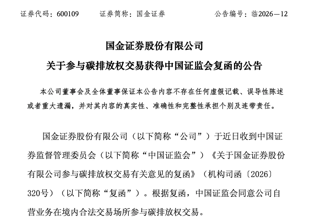 国金证券也于近日收到了相关复函(机构司函〔2026〕320号),中国证监会同意其自营业务参与境内合法交易场所的碳排放权交易。国金证券在金融创新方面一直较为活跃,此次涉足碳排放权交易市场,将为其业务创新提供新的方向。通过参与碳排放权交易,国金证券可以更好地满足不同客户对于绿色金融产品和服务的需求,同时也能在行业竞争中占据更有利的位置。