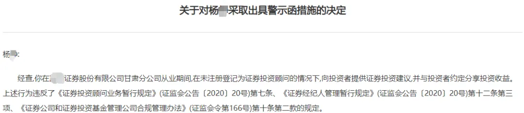 某头部券商营业部员工被罚:违规荐股、分享投资收益,对应的合规提醒!| 案例2024年第161期处罚一个,警示一批。本文的目的亦在于借助个案起到警示教育的目的,同样希望各位读者立足于此,更多关注案例背后暴露出的合规问题。以案促改,以案促进,共同助力证券从业人员的执业能力提升和证券行业的健康高质量发展。2024年10月9日,甘肃证监局发布处罚决定,对某头部券商证券分支机构工作人员杨某采取出具警示函的行证监管措施。无证荐股、约定分享投资收益当事人:杨某,GX证券公司甘肃分公司任职。罚单披露,当事人杨某任职期间,在未注册登记为证券投资顾问的情况下,向投资者提供证券投资建议,并与投资者约定分享投资收益。上述行为违反了《证券投资顾问业务暂行规定》第七条、《证券经纪人管理暂行规定》第十二条第三项、《证券公司和证券投资基金管理公司合规管理办法》第十条第二款的规定。依规,监管部门对当事人进行了处罚。合规提醒针对上述违规行为,对应做些合规提醒,供之参考:一、无证荐股没有注册为投资顾问的从业人员,一定要坚守法规底线,不能心存侥幸。尤其是在当下自媒体兴盛的时代,不少从业人员都在做着“河边走”的事情:一是在朋友圈等社交平台发布荐股相关信息。一些从业人员比较喜欢在微信朋友圈等社交平台发布荐股信息。无论是否注册登记为证券投资顾问,这类行为都具有较大的违规风险。其实,不少从业人员在做这件事的时候,也已意识到自己是游走在违规的边缘,所以在文字表述等方面做了不少的文章。但是壹口觉得,实质重于形式,因此不建议大家发布此类信息!二是在微信群等互联网群组里发布荐股相关信息。相对于朋友圈这类开放式的公众平台,微信群等互联网群组具有一定的私密性,从业人员因此也会更容易放松警惕,不太注意自己的言行。同时,因为群组内具有信息互动的功能,在回答成员问题时,稍不留意就会越出边界。即使注册为投顾,在向客户提供投资建议时,也要严格遵守监管要求:一是证券投资顾问向客户提供投资建议,应当具有合理的依据。投资建议的依据包括证券研究报告或者基于证券研究报告、理论模型以及分析方法形成的投资分析意见等。依据证券研究报告作出投资建议的,应当向客户说明证券研究报告的发布人、发布日期。二是证券投资顾问向客户提供投资建议,应当提示潜在的投资风险,禁止以任何方式向客户承诺或者保证投资收益。三是证券投资顾问不得通过广播、电视、网络、报刊等公众媒体,作出买入、卖出或者持有具体证券的投资建议。二、约定分享投资收益从近年来的处罚案例看,“分享收益”主要有两种表现形式:一是通过代客交易或荐股等形式分享投资收益。情节严重的,就按照“私下接受客户委托买卖证券”进行处罚了,通常是行政处罚,这类情形比较普遍,不再单独列举。情节较轻的,则是按“分享收益”进行处罚,一般是行政监管措施(出具警示函)。对应案例:1.2019年1月,福建证监局对辖区某证券分支机构经纪人采取出具警示函的监管措施,因其存在替客户办理证券认购、交易、资金查询,与客户约定分享投资收益等违规行为。2.2019年10月,吉林证监局对辖区某证券营业部投资顾问采取出具警示函的监管措施,因其存在替客户办理证券交易操作,并与客户约定分享投资收益的违规行为。二是:从业人员与客户拼单投资,共享收益。实践中,拼单投资行为比较常见于投资者之间,尤其是一些门槛比较高的投资品种更易发生。首先要明确一点的是,这类行为是不符合监管要求的。同时,从业人员为客户之间的拼单投资提供便利或协助也是违规的,比如某券商长沙芙蓉中路营业部员工汤某,为推销该公司某集合资产管理计划,通过个人邮箱向客户发送《共同出资协议书》模板,建议客户“拼单”购买,最终被监管问责。 对应案例:2021年4月7日,上海证监局对辖区某证券营业部从业人员进行处罚,因其存在:与客户共同出资购买有关资产管理计划产品,约定收益与风险共同承担的情形。免责声明:本文系个人整理,如有出入,请咨询专业机构并查询相关法律法规及监管部门意见,本人不承担任何责任。关注公众号可了解更多案例分析和规则解读!获取2020-2025年处罚材料、商务合作、信息共享、入群、投稿、转载可扫码添加作者!知识星球《壹口合规》已正式开通,加入后可获取海量资料: