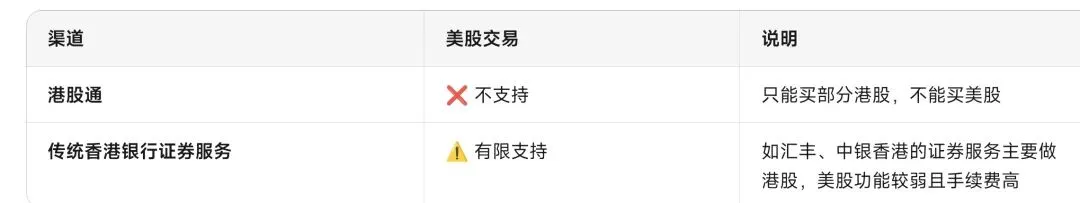 ②传统香港银行证券服务 ,⚠️ 有限支持 如汇丰、中银香港的证券服务主要做港股,美股功能较弱且手续费高。