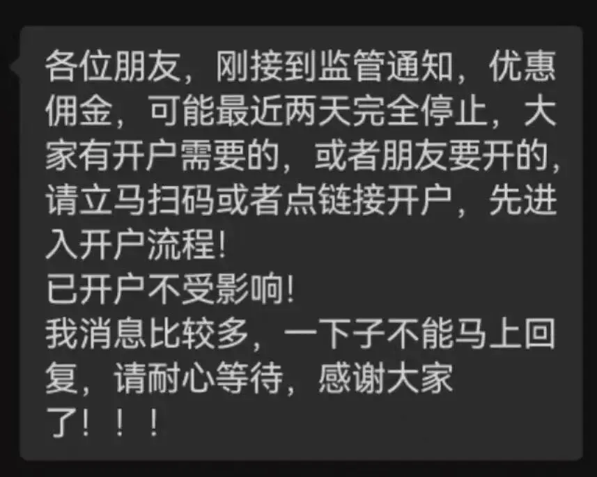 刚收到消息,监管越来越严了,万一免五、万0.85免五、万0.75免五低佣金开户券商,可能真的要停了!