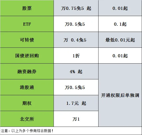 此外,ETF万0.5免5。有融资融券利率需求的,两融利率直接4%,资金量大的头部券商大资金两融利率可以做到3.X%,目前融资也可以免五,北交所港股通免五现在都能做到。