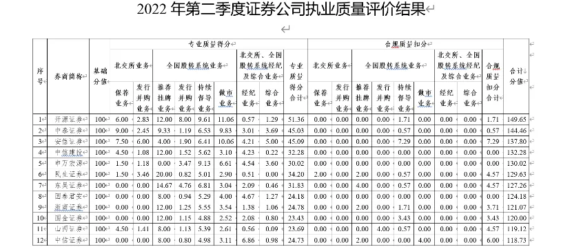 根据昨天发布的二季度主办券商执业质量评价结果显示,其中合计分值排名前10的券商分别为开源证券、中泰证券、安信证券、中信建投、申万宏源、民生证券、东吴证券、国泰君安、浙商证券、国金证券。排名居前的开源证券、安信证券、申万宏源等券商大多都是有北交所、新三板业务特色的券商。