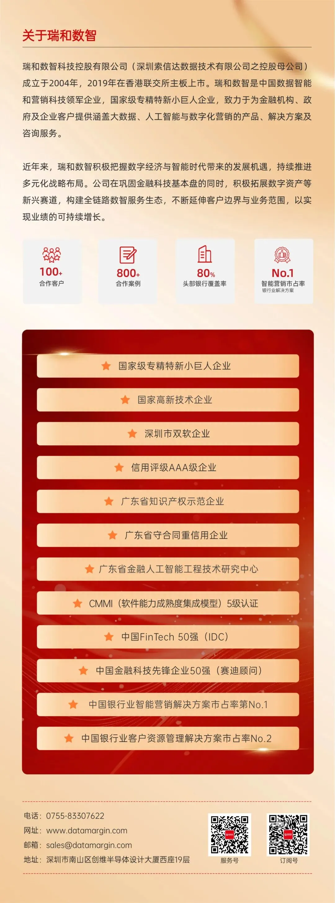 瑞和数智深耕金融行业多年,专注为金融领域提供大数据和智能营销产品及解决方案,在证券行业积累了丰富的实践案例,深谙券商数字化建设的痛点与需求。面对高标准的挑战,瑞和数智提出了极具竞争力的技术方案,并将组建专业核心团队,确保项目高质量、高效率交付。公司将严格遵循该券商海外业务平台的国际技术规范,在移动开发、WEB前端、后端开发等全技术栈上匹配项目要求,助力客户实现技术能力复用、运营效率提升、合规安全性增强的建设目标,推动其海外业务流程的线上化、智能化与合规化。
