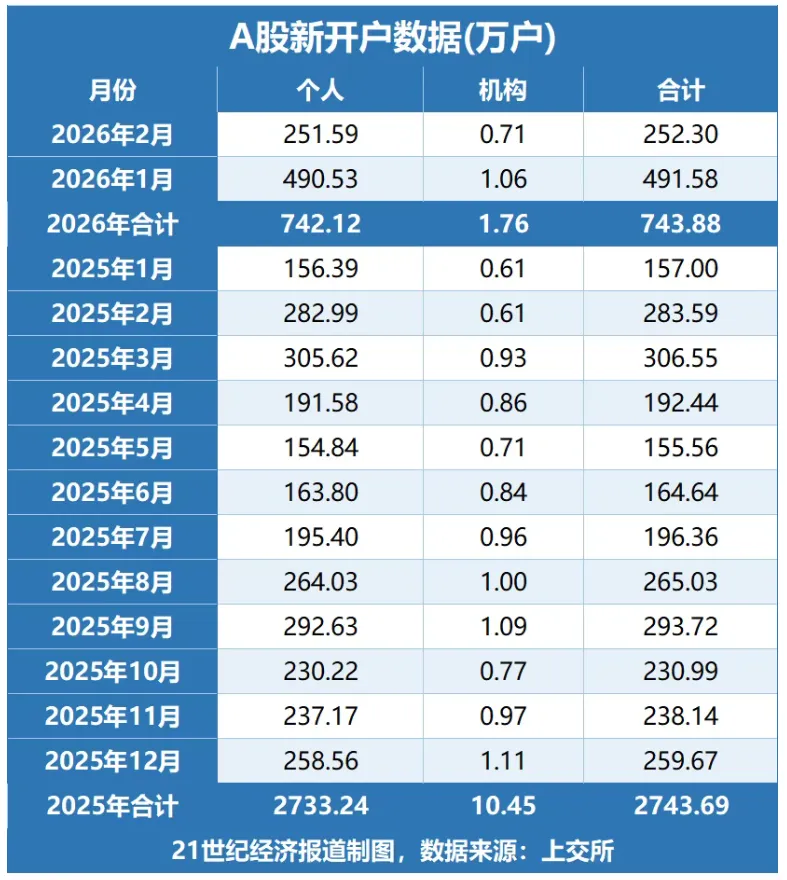 大家好!3月3日,上交所最新披露数据显示,今年2月投资者新开A股账户达252.3万户。其中,2月个人新增开户251.59万户,机构新增开户0.71万户。