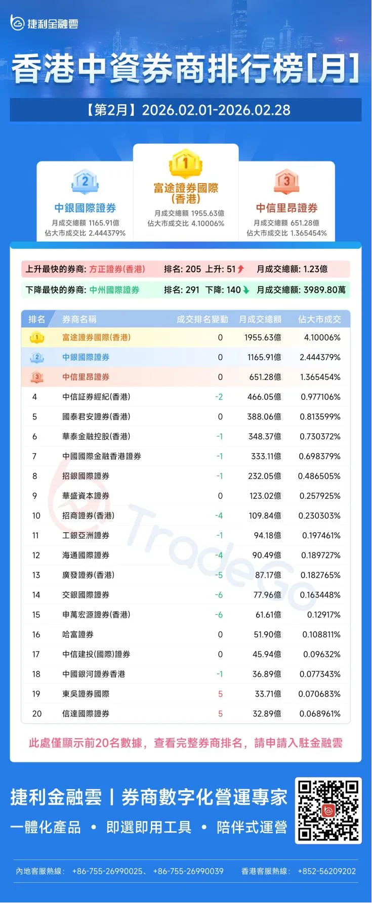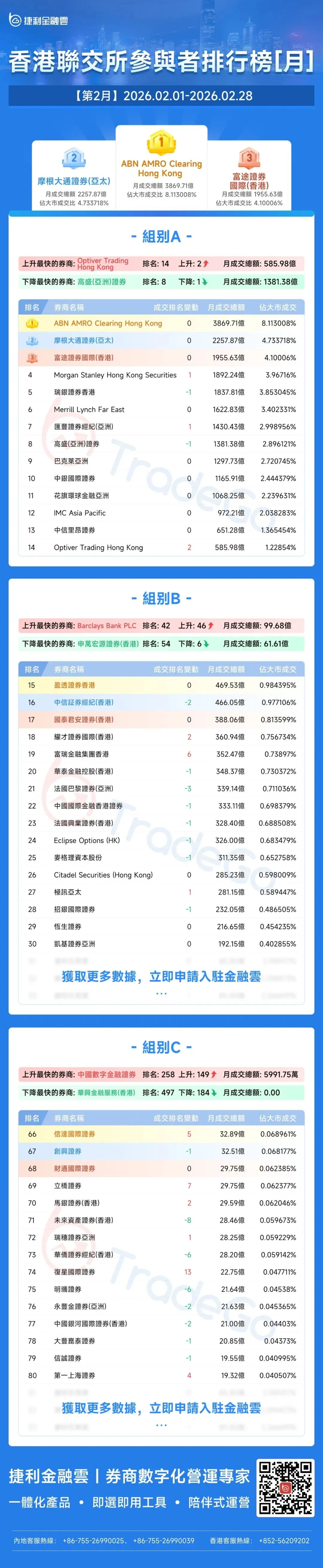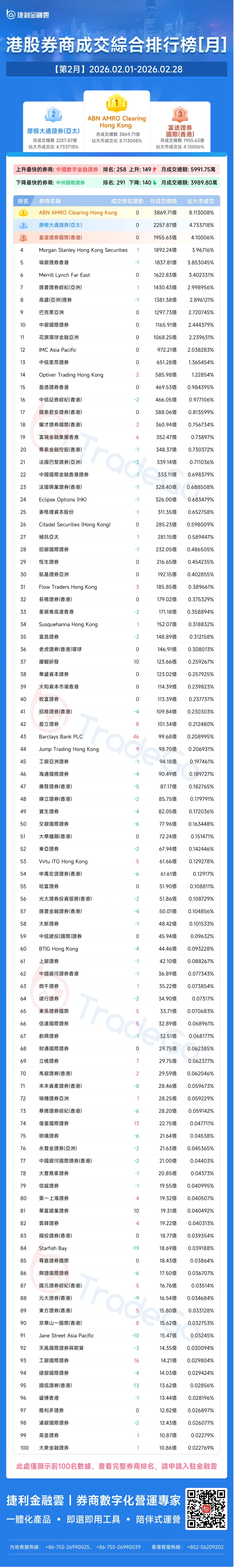 上月(2.01-2.28)ABN AMRO Clearing Hong Kong以月成交總額3869.71億,占大市成交比8.11%,位居成交排行榜首,摩根大通證券(亞太)和富途證券國際(香港)分別以2257.87億、1955.63億緊隨其后。