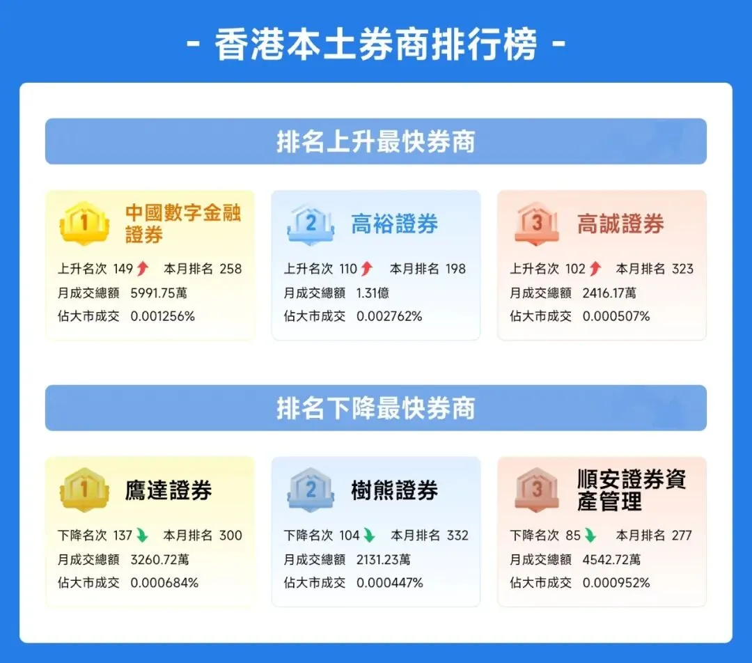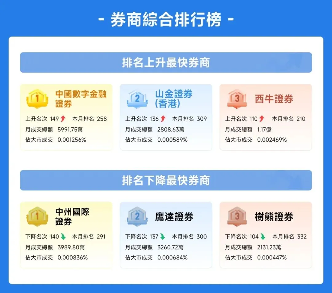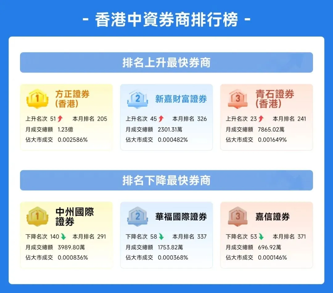 中資券商中排名異動上升最快的券商為方正證券(香港)、新嘉財富證券和青石證券(香港)。其方正證券(香港)上月成交总额1.23億,排名205,相較前一月上升了51。