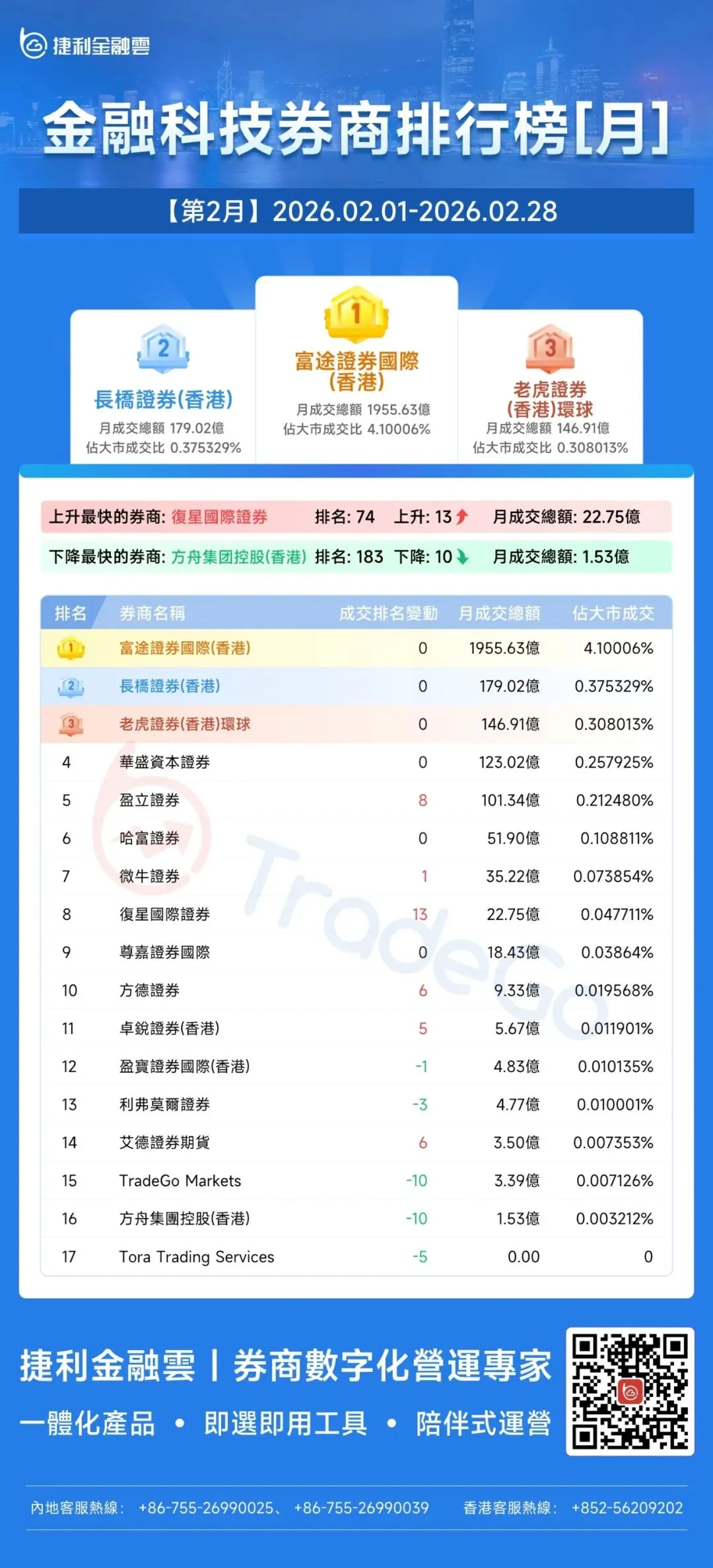 根據參照金融科技券商分類統計數據中,富途證券國際(香港)以月成交總額1955.63億依然為該分類的第一名,其中長橋證券(香港)月成交總額179.02億占大市成交比0.38% 為金融科技券商排名的第二名,在綜合券商(511家)月排名35名。老虎證券(香港)環球月成交總額146.91億占大市成交比0.31%, 為金融科技券商排名第三名。