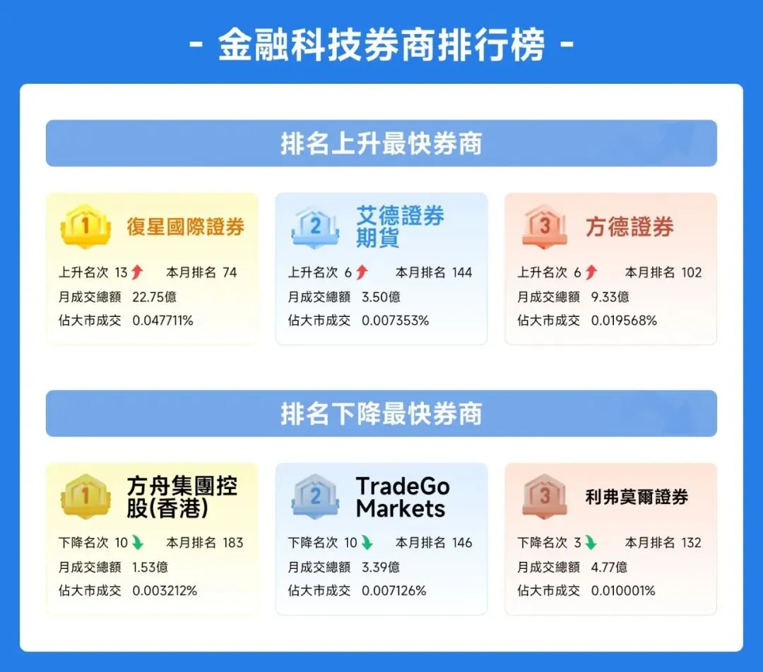 金融科技券商排名異動上升最快的券商為復星國際證券、艾德證券期貨、方德證券;排名異動下降最快的券商有方舟集團控股(香港)。
