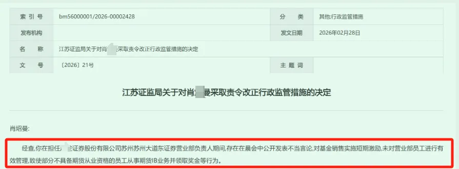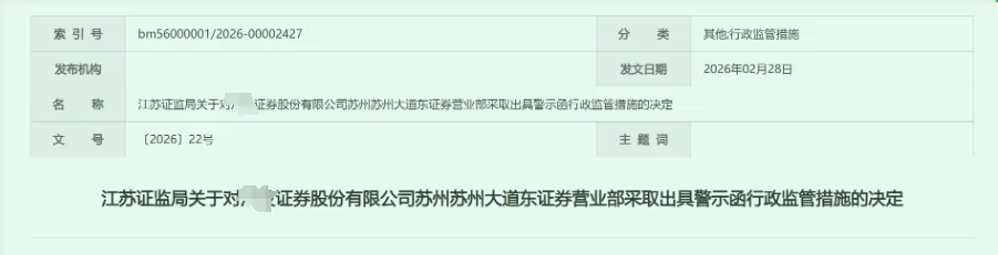2026年2月28日,江苏证监局对GF证券苏州营业部开出警告,负责人肖某曼被责令整改并记入诚信档案。
