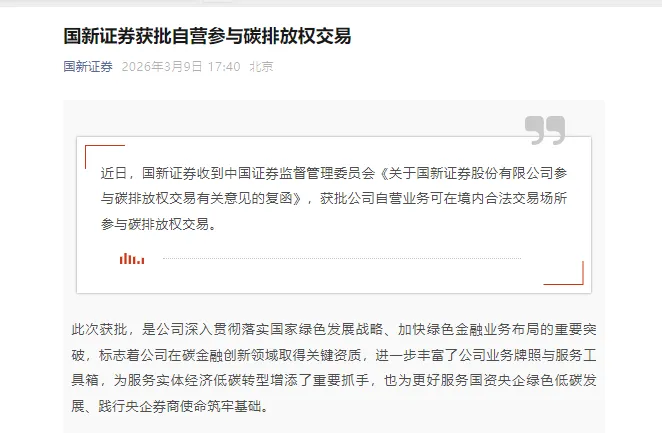 其中,已有部分券商有实际进展:2024年12月,国元证券公告称获准参与碳排放权交易,并于2026年2月11日落地自取得相关碳市场业务资格以来的首单碳配额回购业务,标志着公司碳金融业务完成了从资质获取到市场实践的跨越,实现了业务落地“零的突破”。