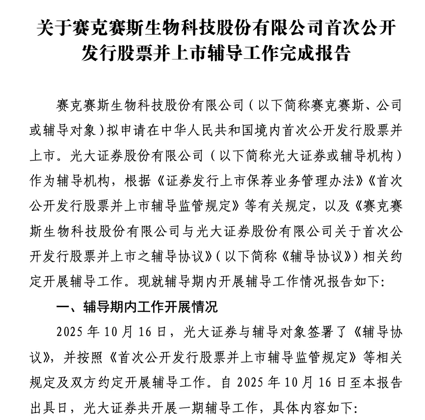 近日,赛克赛斯生物科技股份有限公司(以下简称“赛克赛斯”)披露IPO辅导工作完成报告,辅导机构为光大证券股份有限公司(以下简称“光大证券”)。