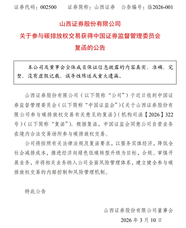 再添“全省首家且唯一”头衔,本土券商山西证券入场500亿赛道3月10日晚,山西证券公告称,公司于近日收到中国证监会《关于山西证券股份有限公司参与碳排放权交易有关意见的复函》,同意山西证券自营业务在境内合法交易场所参与碳排放权交易。此举意味着山西证券成为山西全省首家且唯一一家拥有该业务权限的本土券商。碳排放权交易市场是全国碳达峰、碳中和战略目标达成的重要政策工具之一。券商获得碳排放权交易权限后,可作为交易对手方向市场提供国内外碳排放权品种现货的双向交易报价,以服务于客户的建仓、变现等需求。全国碳排放权交易市场在15年前便已开始“铺垫”。早在2011年,北京、天津、上海、重庆、湖北、广东及深圳7个省市便启动碳排放权交易试点工作。2016年,福建成为第八个试点区。2021年7月16日,全国碳排放权交易市场正式开市。根据数据,截至2025年底,全国碳排放权交易市场配额累计成交量达8.65亿吨,累计成交额576.63亿元,成交额是八大试点区阶段的12倍有余。随着碳达峰目标计划时间点的临近,全国碳排放权交易市场成交额仍将以倍数增长。当前正值全国两会期间,2026年政府工作报告中再次强调要进一步扩大碳排放权交易市场覆盖范围,这成为券商集中领取“入场券”的政策背景。据悉,仅3月以来便有包括国海证券、国金证券、长江证券等获批。截至目前,已有25加券商拥有参与碳排放权交易的权限。官网显示,山西证券是山西省属全牌照大型金融控股集团金融投资控股集团旗下子公司。公司成立于1988年7月,是全国首批证券公司之一,2010年11月15日在深交所上市,不仅是山西省内首家金融服务类上市企业,也成为了中西部地区首家通过IPO在深交所上市的证券公司。发展至今,山西证券构建起了全业务链布局与协同发展体系,业务涵盖财富管理、企业金融、资产管理、FICC、权益业务、国际业务等板块。世界晋商网认为,山西证券本次成功拿下参与500亿甚至更大市场的“入场券”,于其自身而言具有持续优化资产配置,加强绿色金融投资,提升品牌形象,打造新盈利点等多重战略意义,也将成为山西发展绿色经济、深度赋能碳达峰碳中和战略的典范。山西证券表示,公司将按照要求以服务实体经济,降低全社会减排成本,推进经济向绿色低碳转型升级为目标,合规、审慎开展业务。