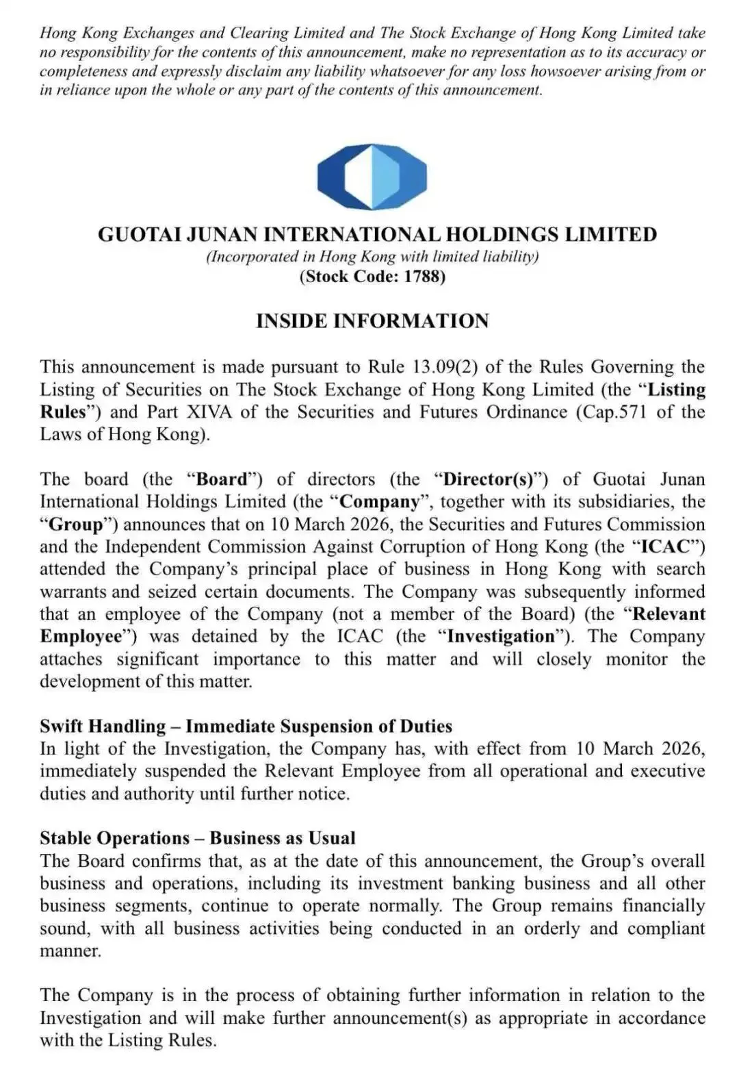 3月12日,国泰海通子公司国泰君安国际公告称,3月10日,香港证券及期货事务监察委员会和廉政公署到访公司香港主要营业地点执行搜查令,并带走部分文件,公司一名非董事会成员的雇员被廉署拘留,公司对此高度重视,将继续密切监察此事发展。也进一步验证了上述报道。