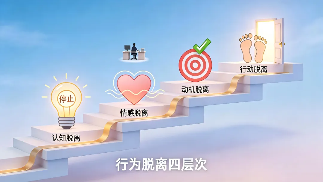 书里提出一个关键概念:目标脱离得经历认知脱离、情感脱离、动机脱离、行动脱离四个步骤。
