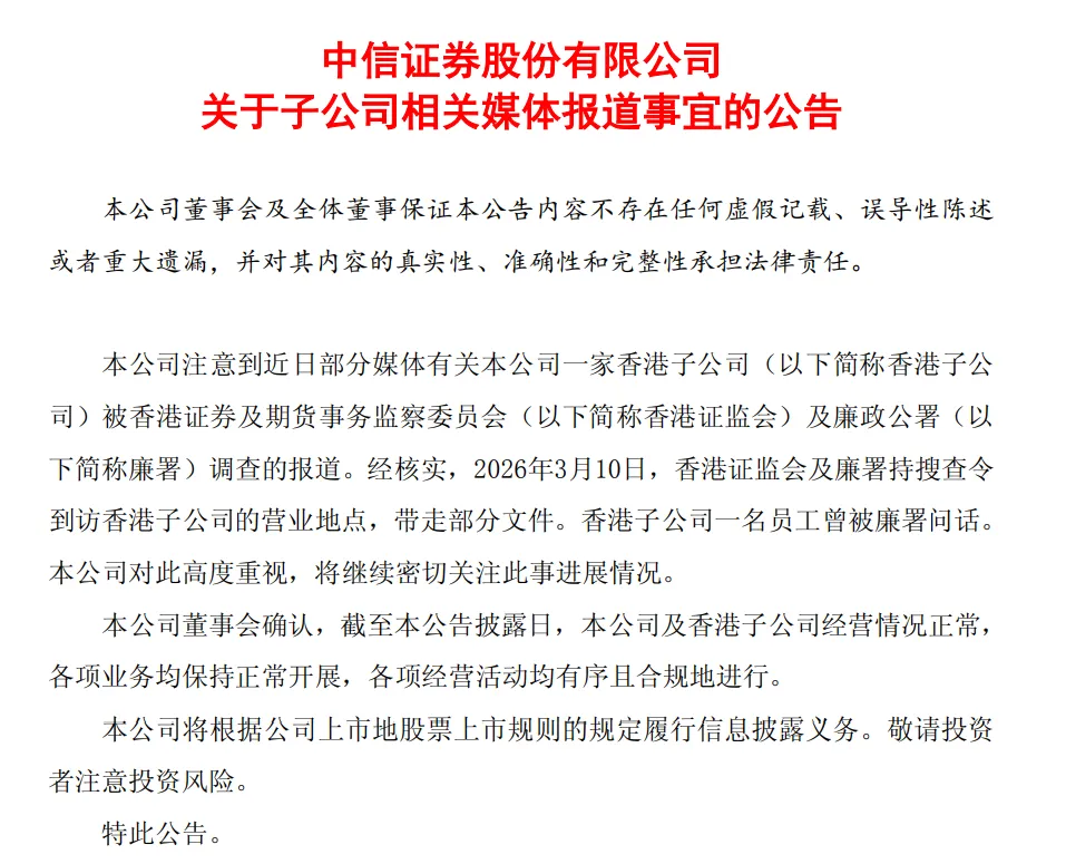 中信证券公告称,公司注意到近日部分媒体有关公司一家香港子公司被香港证券及期货事务监察委员会(以下简称香港证监会)及廉政公署(以下简称廉署)调查的报道。经核实,2026年3月10日,香港证监会及廉署持搜查令到访香港子公司的营业地点,带走部分文件。香港子公司一名员工曾被廉署问话。