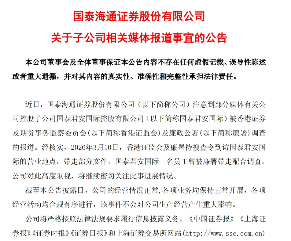 3月12日晚间,国泰海通公告称,近日,公司注意到部分媒体有关公司控股子公司国泰君安国际被香港证监会及廉署调查的报道。经核实,2026年3月10日,香港证监会及廉署持搜查令到访国泰君安国际的营业地点,带走部分文件,国泰君安国际一名员工曾被廉署带走配合调查。公司对此高度重视,将继续密切关注此事进展情况。