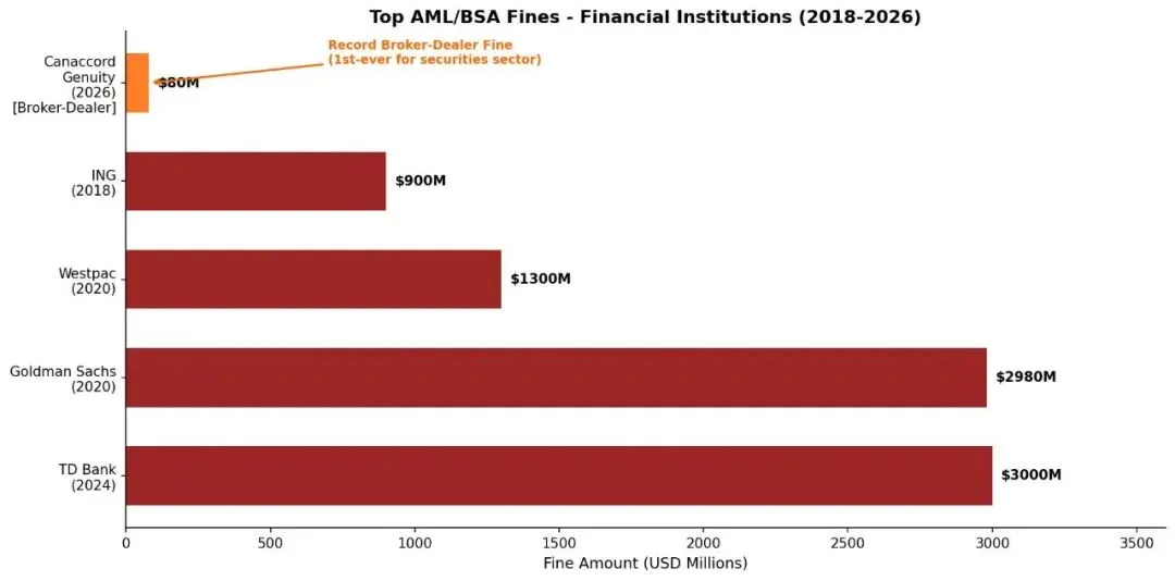 2026年3月6日,FinCEN以Canaccord Genuity LLC故意(willful)违反《银行保密法》为由,签署执法令(Consent Order No. 2026-01),开出8000万美元罚款,创下美国证券业AML执法史上最高纪录。该罚款金额超过此前对TD Bank(2024年,30亿美元,但TD Bank为存款类机构而非券商)以外,专门针对券商类机构的所有历次处罚之和。