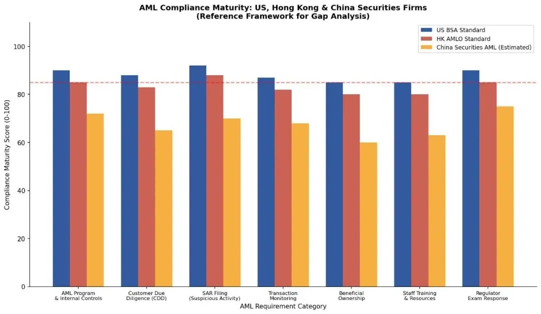 图3:AML合规成熟度对比:美国、香港与中国证券公司参考框架