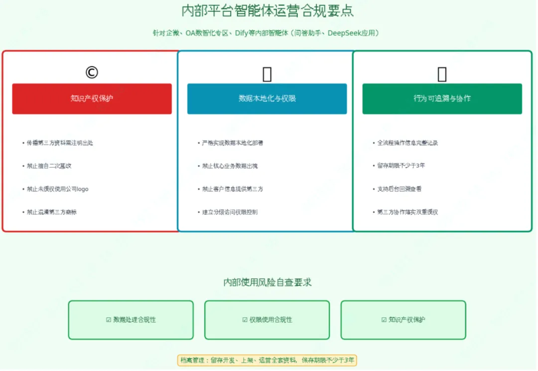 针对内部员工使用的合规问答助手、大模型相关应用、审计报告生成等类AI智能体,需重点关注三类潜在法律合规风险,强化日常运营管控: