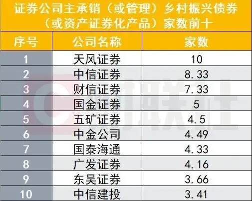 主承销(或管理)乡村振兴债券(或资产证券化产品)金额方面,中信证券、中信建投、国泰海通、天风证券和华泰联合摘得前五。