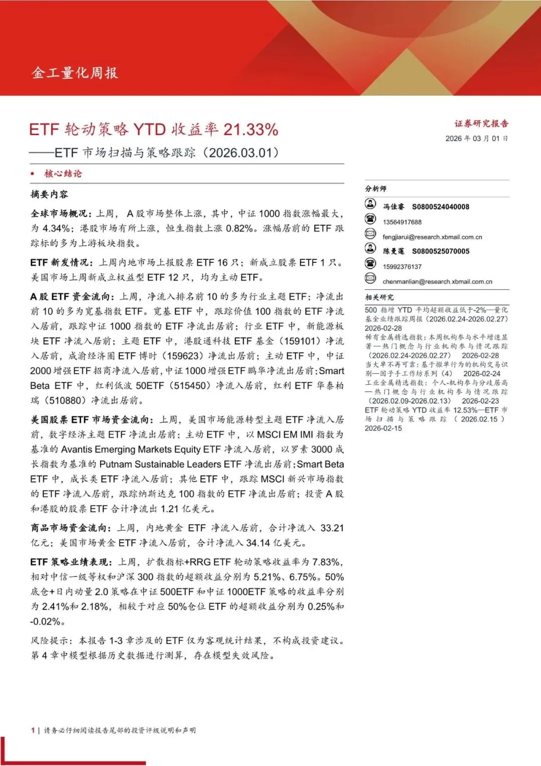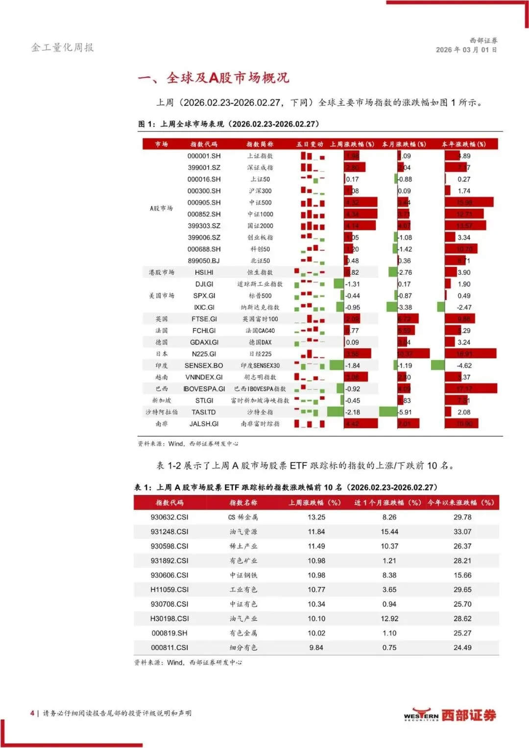 全球市场概况:上周, A 股市场整体上涨,其中,中证 1000 指数涨幅最大,为 4.34%;港股市场有所上涨,恒生指数上涨 0.82%。涨幅居前的 ETF 跟踪标的多为上游板块指数。