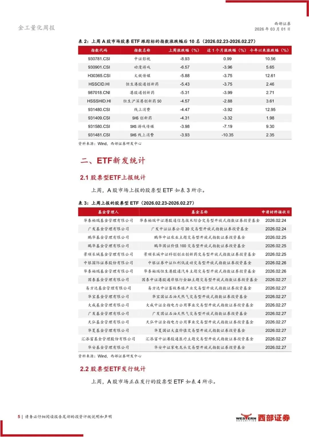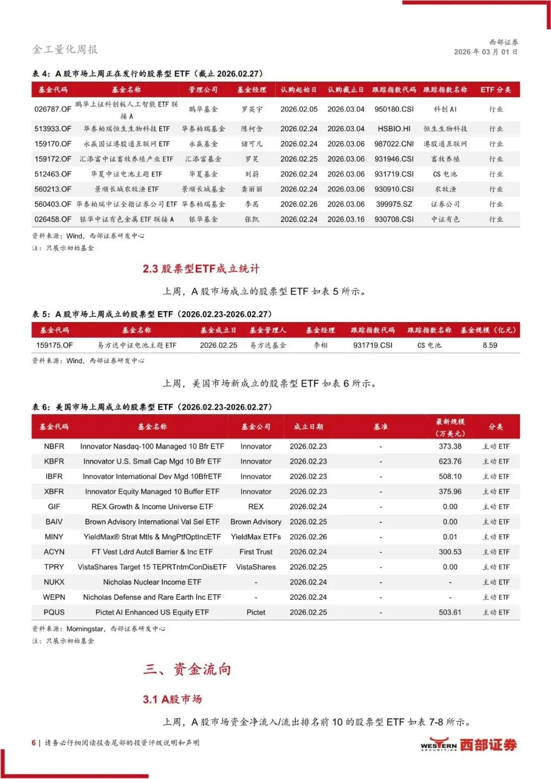 ETF 新发情况:上周内地市场上报股票 ETF 16 只;新成立股票 ETF 1 只。美国市场上周新成立权益型 ETF 12 只,均为主动 ETF。