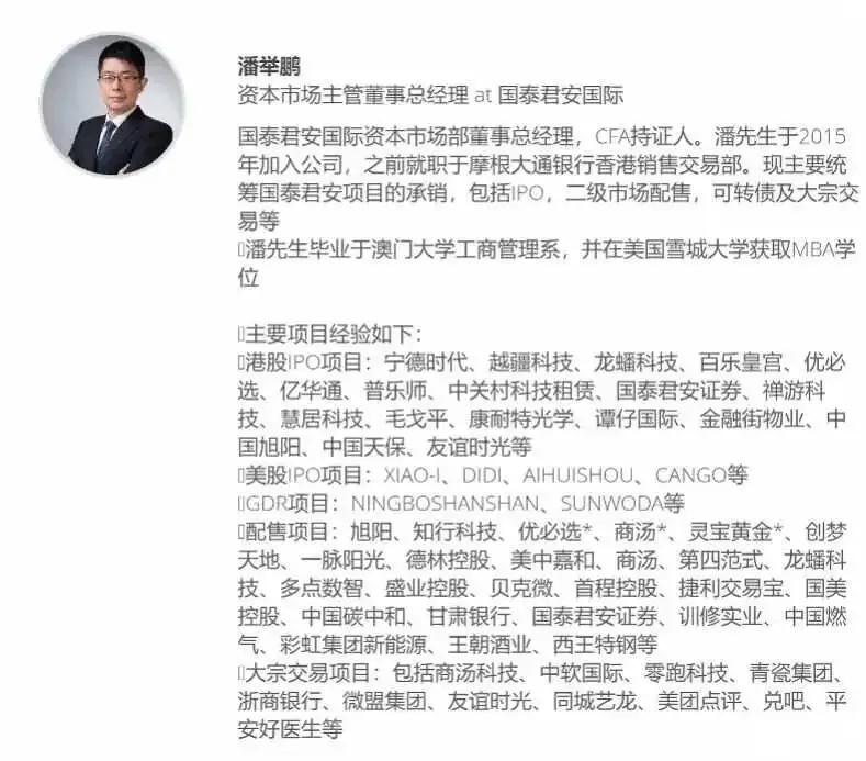公开资料显示,潘举鹏(Samuel Pan)在香港资本市场拥有超过15年的执业经验。他于2015年加入国泰君安国际,之后一路升至ECM主管。