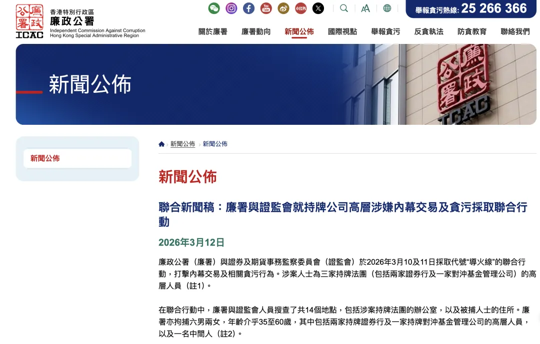 3月12日,廉署發布公告稱,今次聯合行動共搜查了14個處所,包括3家涉事公司辦公室及被捕人士住所;被抓8人(6男2女)年齡介乎35歲至60歲,包括兩家持牌證券行及一家持牌對沖基金管理公司的高層人員,以及一名中間人。