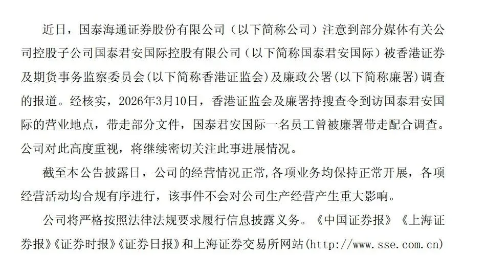 國泰君安國際指出,鑒於調查,公司已於3月10日即時暫停相關僱員的所有營運及執行職務及權力,直至另行通知為止。該公司補充,集團之整體業務及營運,包括投資銀行業務在內的所有業務板塊,均維持正常開展,公司財務穩健,各項經營活動合規有序地穩定進行。