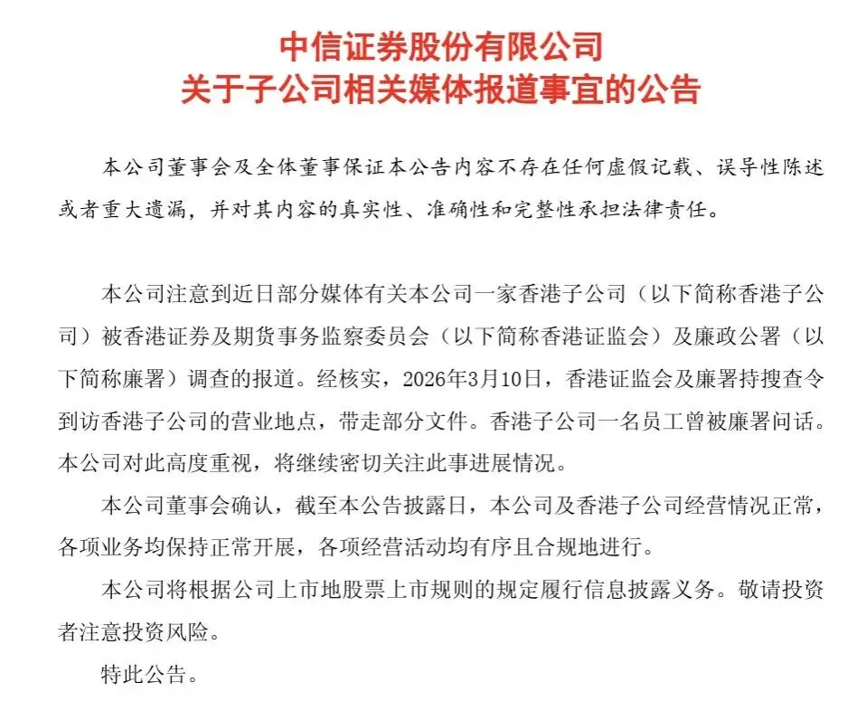 中信證券也在3月12日發出公告,表示證監會和廉署確實於3月10日持搜查令到訪香港子公司的營業地點,並帶走部分文件,1名員工曾被廉署問話。