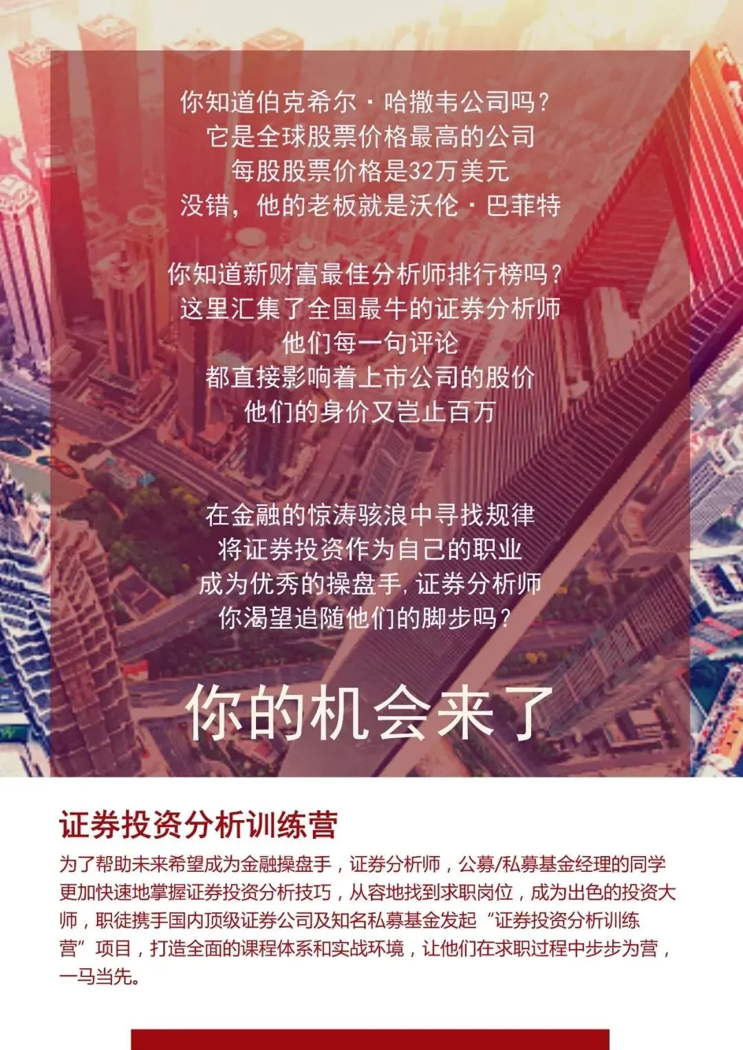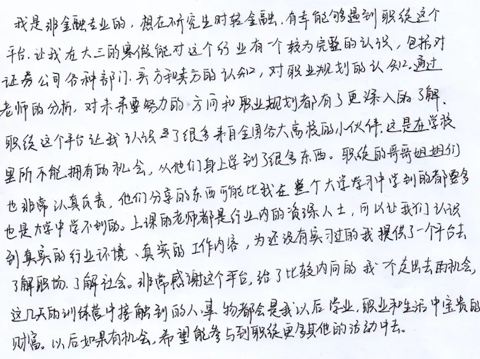 项目人数:每期30人(报满即停止接收申请)适合人群:计划5年内进入证券投资行业的在校学生及毕业两年内的在职者,或对股票及金融衍生品充满兴趣的同学适合专业:专业不限,经管类专业优先