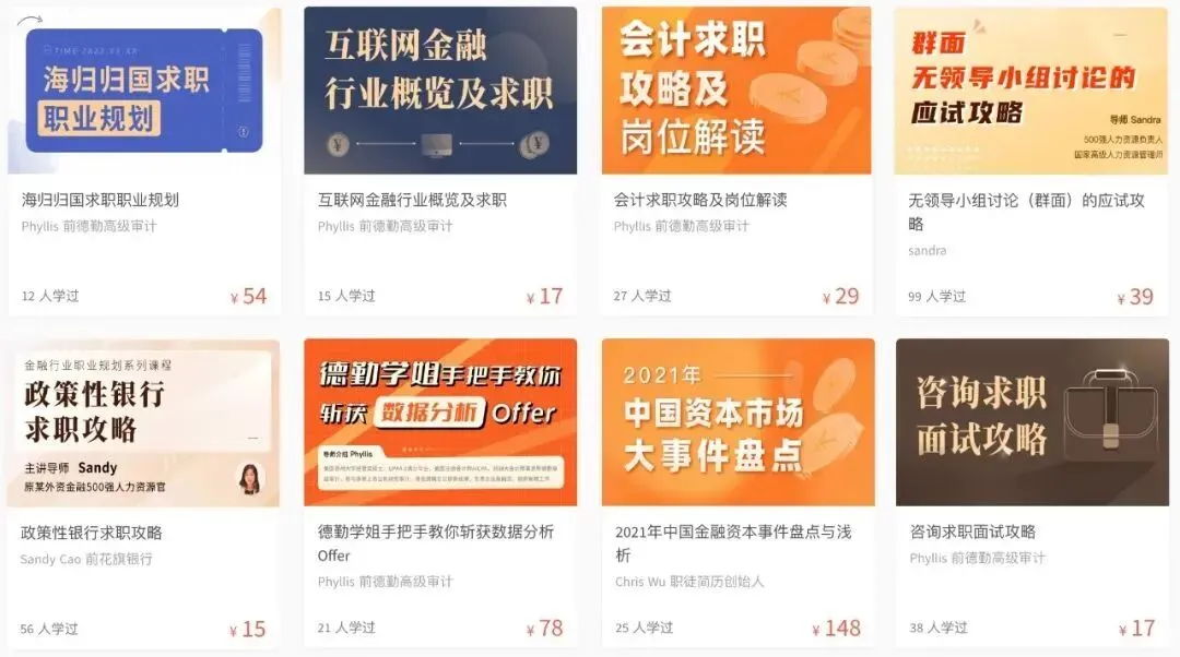 简历辅导,求职规划,行业解读,岗位解读,求职技巧,经验分享,投资分析,职业技能(财报分析、证券交易、量化分析、市值管理......)线上课程将持续更新!