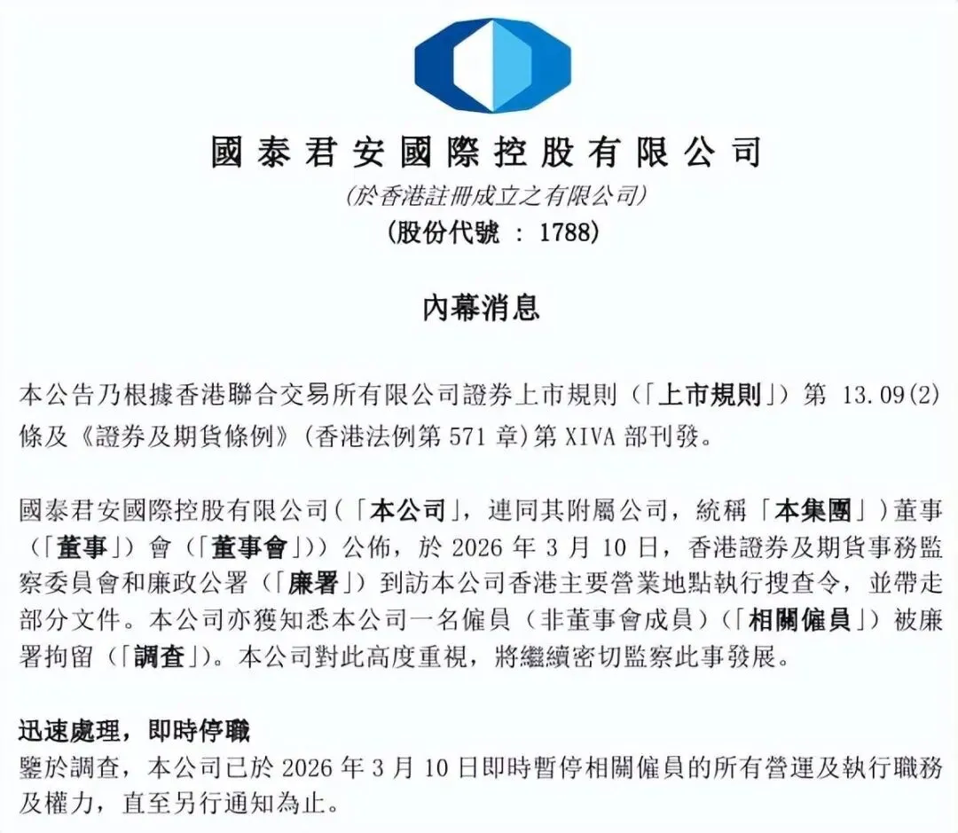 公告并未直接点名涉案券商,不过,国泰君安国际(01788.HK)发布公告,证实了公司涉及此次搜查行动,一名雇员(非董事会成员)被廉署拘留。公司已于当日即时暂停相关雇员的所有营运及执行职务及权力,直至另行通知为止。