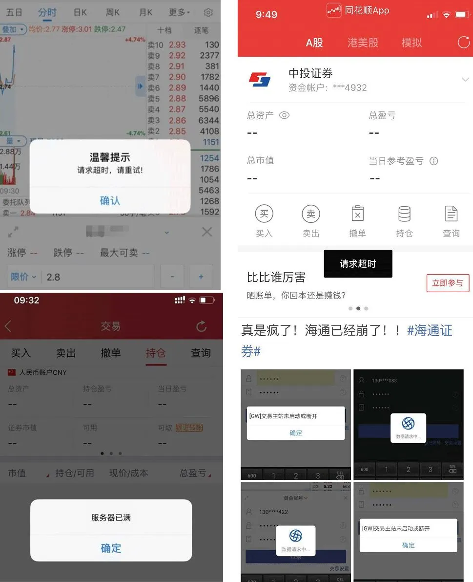 有股票投资者在网上大加吐槽,称开盘后几分钟,所用券商客户端APP就不能正常登录,无法进行正常交易。
