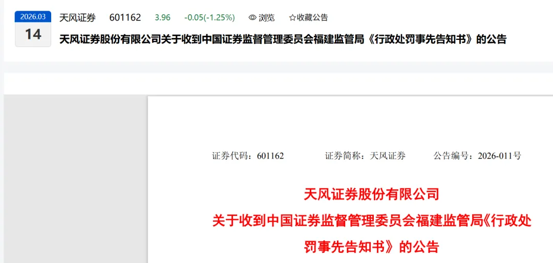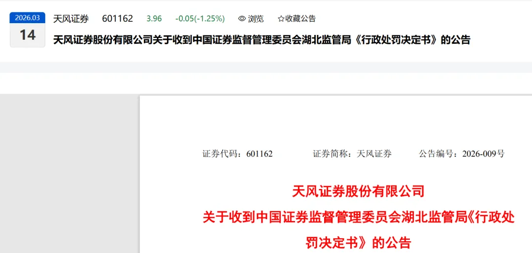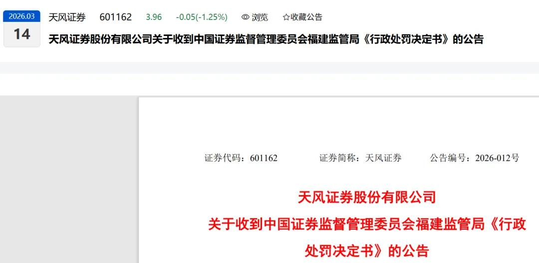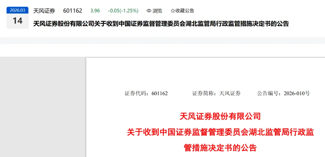 天风证券在2026年3月13日这天,收到了来自证监会福建和湖北两家监管局的“罚单”和“整改令”,问题不少,处罚也挺重。