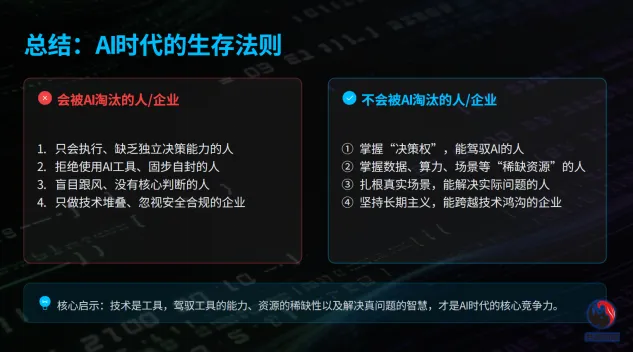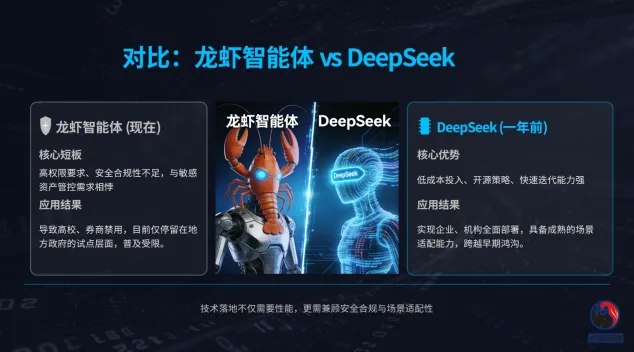 但是使用腾讯龙虾后,耗时稍微多一倍,大概5分钟左右完成,复核的结果能用,这让我挺惊奇的,它的表现比通用大模型要好。后面我多次尝试,腾讯龙虾比现有大模型的幻觉都要低,如果增加技能,能力会更强。当然,因为存在数据安全风险,我没有输入重要数据,使用的非主力电脑,也做好了数据物理隔离防火墙。未来随着大厂的进场,补齐安全合规短板、适配政务、产业场景和技能,就像我们手机的丰富的App生态一样,龙虾智能体也会跨越鸿沟,进入大爆发阶段。AI 时代的智能体阶段:谁会被淘汰?谁不会被淘汰?未来的智能体能写、能算、能查、能跑流程,那么,重复劳动、标准化工作、纯执行岗位最先被替代。2、不敢用AI、拒绝用工具的人,就像当年不会用电脑、不会用Excel的人,现在一样会出局。DeepSeek火就追DeepSeek,龙虾火就冲龙虾,没有独立认知、没有风险意识,在尝鲜期当炮灰。高校、券商一禁就死,说明安全不过关,技术再强也走不远,不做合规、不做可控、不做私有化,迟早被市场淘汰。相反,再看看有4种不会被AI以及智能体淘汰的人跟企业。1、掌握“决策权”的人,AI提供信息、方案、效率,但要有人来拍板、担责、定方向、定战略。2、掌握“稀缺资源”的人,比如说数据、算力、电力、牌照、场景、信任...谁掌握资源,谁就掌握AI的命门。