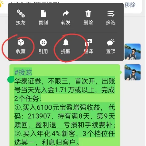 不用额外下载软件,微信自带功能就能搞定资料整理、任务提醒、信息查询,大幅减少做单耗时,老手都在用,新手直接抄作业:微信收藏:接到单子后,整理任务要求、二维码、文件,长按收藏,后续随时调取,不用翻聊天记录。微信提醒:选中入金、持有、出金等关键时间点,设置微信提醒,避免错过节点导致任务失败。聊天记录查询:在羊毛群搜自己的姓名/客户号/券商名,快速查询单月结算、任务记录,收益一目了然。头像更多信息:点开群主头像,看“共同群聊”,快速找到做单群,接龙、交流、查历史单子一步到位。五、闲钱增值进阶:除了新客理财,这些低风险工具也能赚