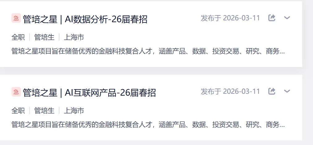 东方财富证券更是推出“管培之星”和“科技新锐”项目,面向金融科技型人才,设置AI数据分析、AI互联网产品等管培生岗位,岗位明确要求掌握大模型技术、Python编程等核心技能。