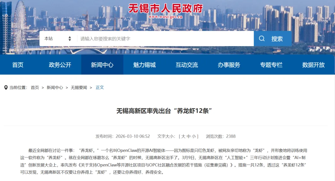 无锡高新区紧随其后,推出“养AI龙虾12条”,单项支持最高达500万元,重点鼓励将“龙虾”与工业质检、设备预测性维护等垂直领域结合。